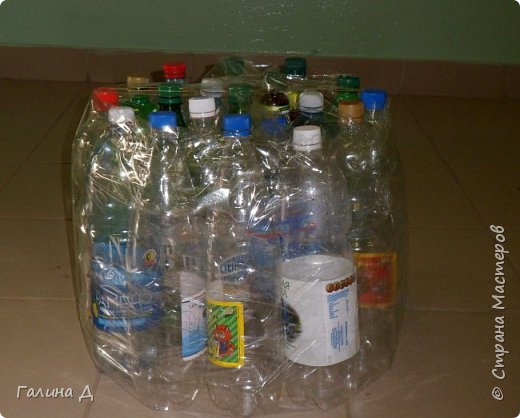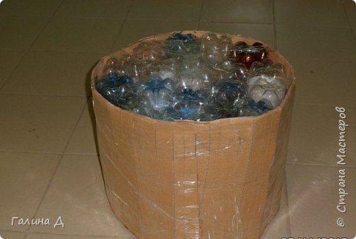 Первый круг бутылок прочно замотали скотчем. Потом второй круг. Скотча не жалеем. Бутылки плотно прилегают друг к другу и одной высоты!