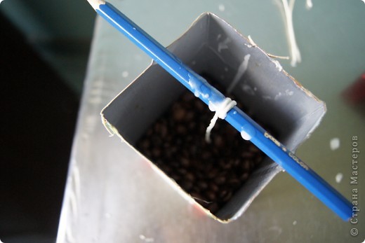 Нам потребуется: свечи парафиновые, кофе в зернах, и коробочка-форма (я использовала коробку из под сока)