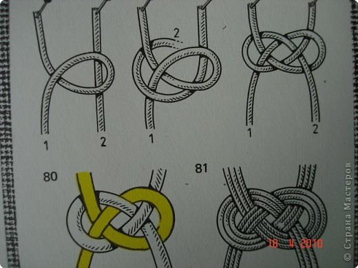 Берём дополнительный шнур 1м 50 см и на нём вплотную делаем бриду. Затем делим на участки по 10 нитей (один лепесток) и плетём четырёхлепестковый цветок репсовыми узлами(рисунок выше). Внутри каждого лепестка плетём двойной плоский узел (его можно и не делать). По краям у меня идёт узор листики(4 шт. вниз) с узором "Жозефина"(см. рис.) внутри (можно не делать).