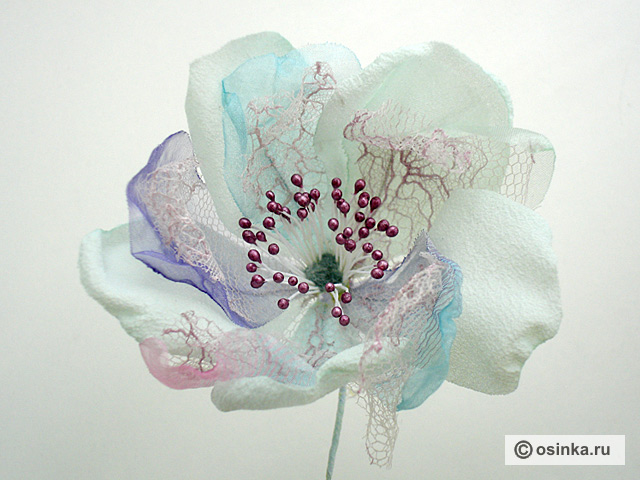 В данной розе используются три фактуры ткани, это синтетический шелк, кружево и органза. Варианты подбора тканей могут быть самыми разнообразными, главное чувство меры. Если сомневаетесь, то вполне достаточно одного вида, например, шифон или эксцельсиор.