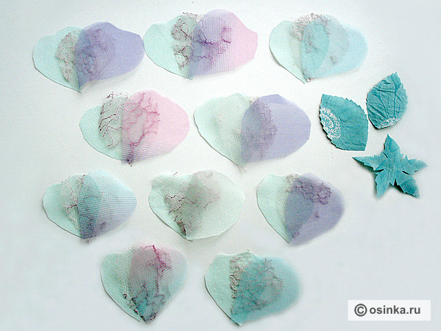 03. В один лепесток собрать три лепестка разных фактур(или одинаковых) следующим образом: на лепесток положить проволочку, обвитую в тон ткани, сверху тонкую полоску клеевой паутинки, затем с небольшим смещением следующий лепесток, опять полоска клеевой паутинки и последний лепесток также с небольшим смещением. Придерживая лепестки, прогладить утюгом через влажную марлю зону центральной жилки.