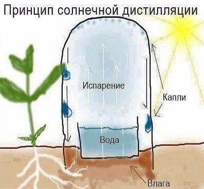 Этот способ основан на принципе солнечной дистилляции - нагревание воды до парообразного состояния с последующей конденсацией пара в воду. Для этого используем две пластиковые бутылки разного размера.