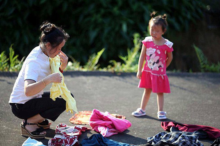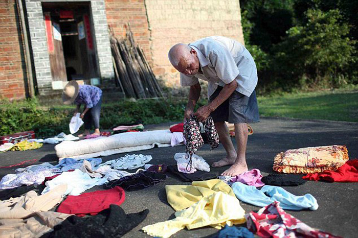 Кишоу помогает жене складывать одежду.