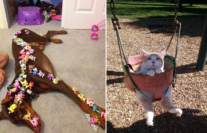 Если кому-то интересно, как выглядит терпение, то стоит понаблюдать за тем, как домашние животные безропотно терпят выходки детей. Кажется, они так обожают своих маленьких хозяев, что готовы простить им абсолютно всё. Ну кого же ещё детишки могут раскрасить, подстричь, накрасить, покачать на качелях или запихнуть в ползунки. Хвостатые сносят всё, а детишки активно этим пользуются.
