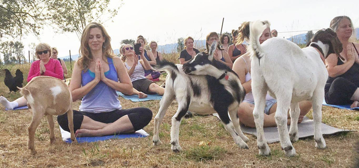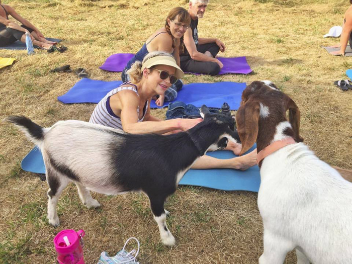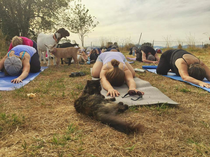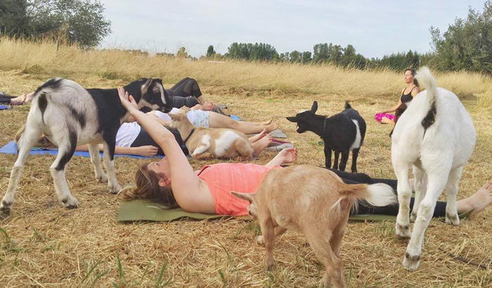 Есть йога, которой занимаются при супер-высокой температуре, есть йога, которой занимаются полностью нагишом, а эта йога проводится на природе в окружении миниатюрных дружелюбных козочек, которые чувствуют себя совершенно спокойно рядом с незнакомыми людьми, и нередко приходят за тем, чтобы поластиться и напроситься на ласку.