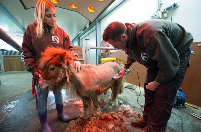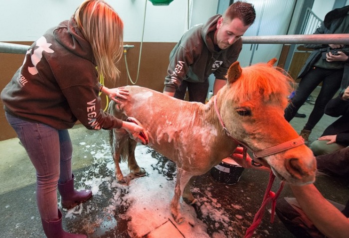 Затем пони помыли, обстригли его длинную шерсть, обработали раны и накрыли попоной. Сейчас животному обеспечен хороший уход, и работники приюта надеются, что Поли в скором времени поправится.