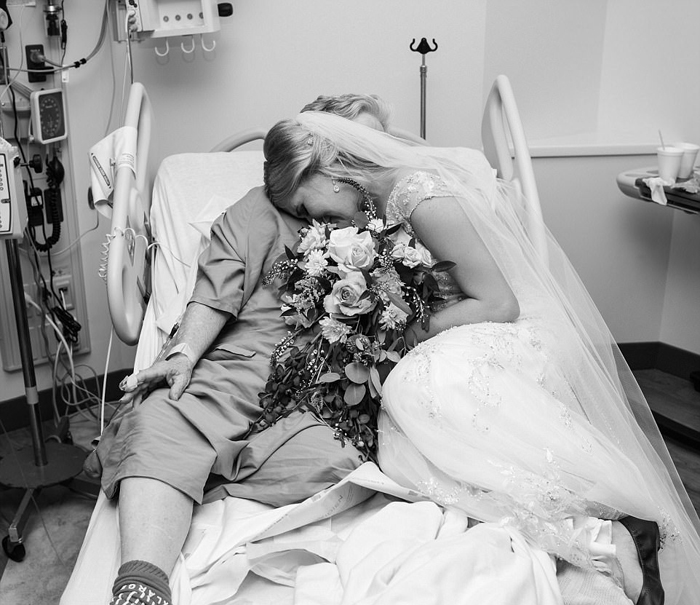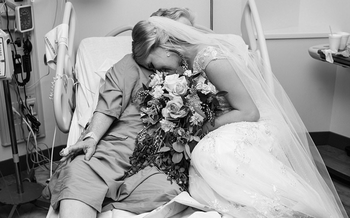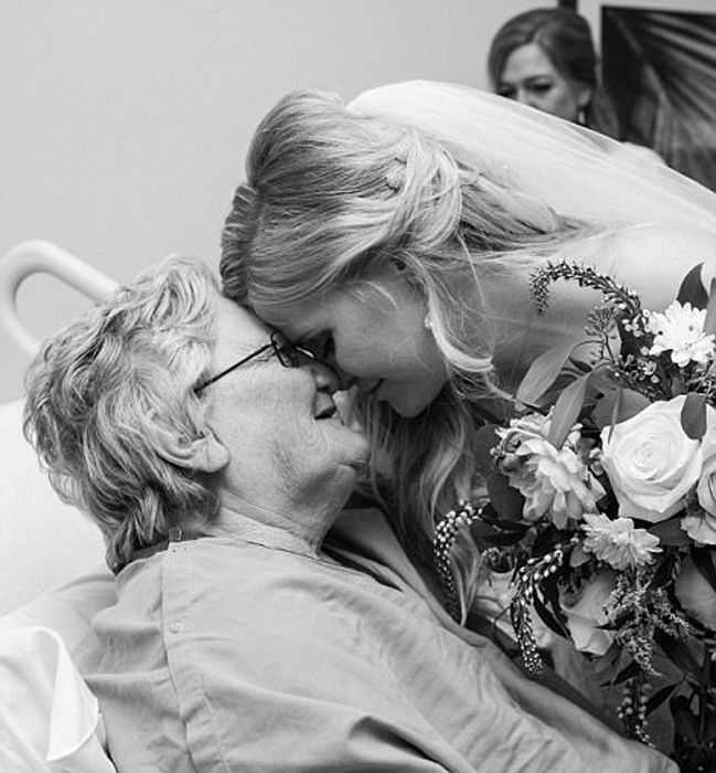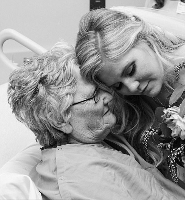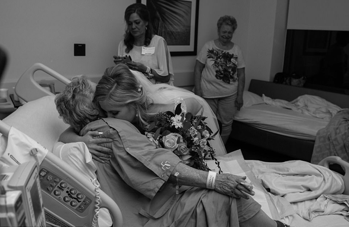 Фотограф снял встречу внучки в подвенечном платье и бабушки, лежащей на больничной койке, в черно-белом цвете. Джессика по-прежнему держала в руках свадебный букет, с ним же она забралась на постель к бабушке, чтобы покрепче ее обнять. "Моя бабушка - самый милый человек в мире. И ее объятие было наполнено такой любовью, что я сразу поняла, что всё будет хорошо. Стоило мне ее обнять, как мое сердце снова забилось с прежней легкостью."