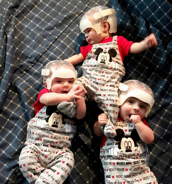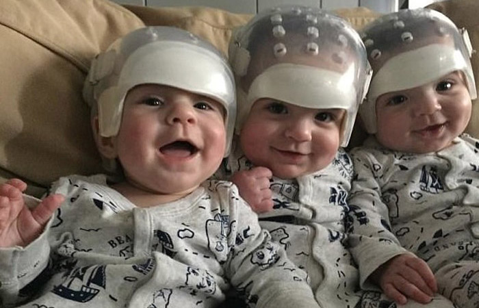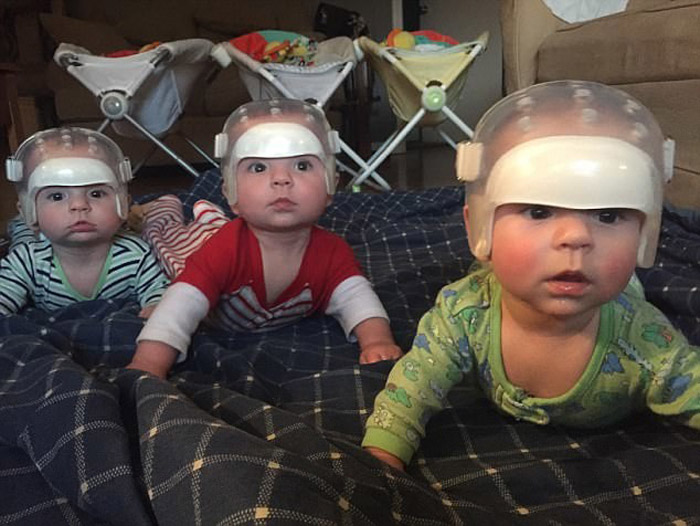 После операции детишкам надели специальные шлемы, которые защищают голову малышей и придают их черепам правильную форму. Такой шлем легкий, но при этом очень прочный, он позволяет коже малышей дышать, но при этом его надо носить минимум 23 часа в сутки. "Ну да, некоторое время детям пришлось привыкать к шлемам, но сейчас уже нет никаких проблем ни когда я их снимаю, ни когда надеваю их обратно," - говорит мама Эми.