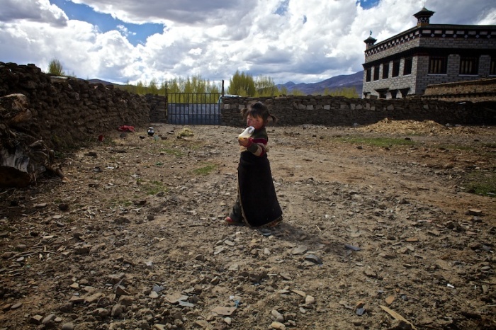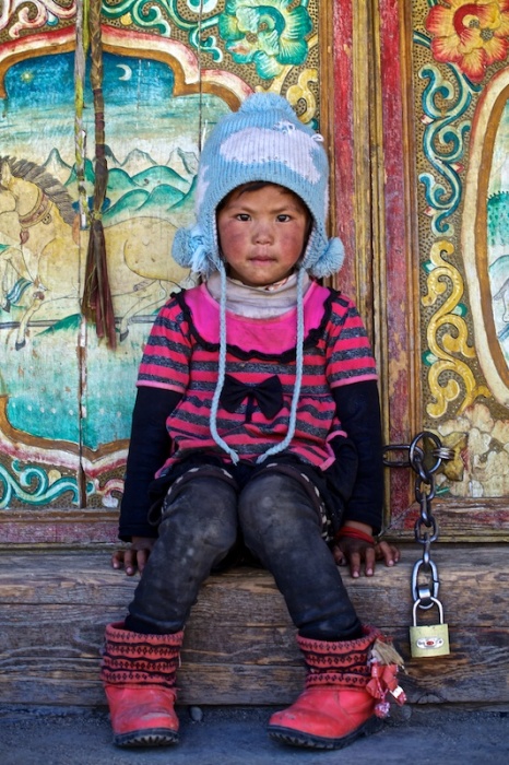 Тибетские дети часто ходят вместе со своими семьями, которые совершают кору.