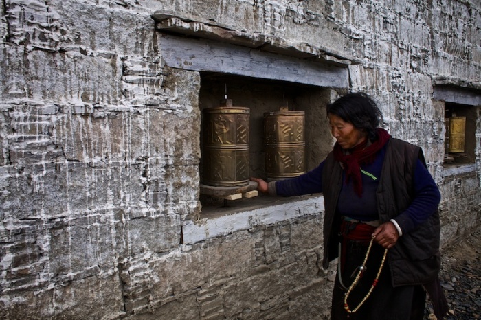 Старая тибетская женщина поворачивает цилиндры, которые сделаны из позолоченной бронзы и покрыты буддийскими надписями и символами, произнос я мантру Ом Мани Падме Хум.