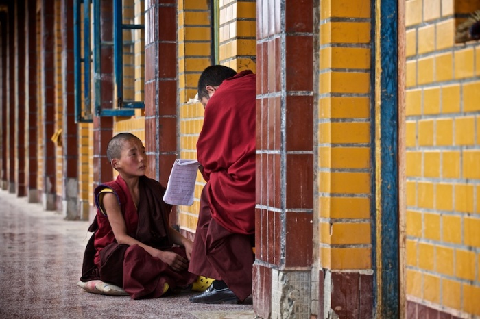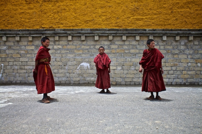 Мальчики, играющие возле храма Ганден Тубчен Чоххорлинг, внимательно слушают учителя, который вышел вернуть их в монастырь.