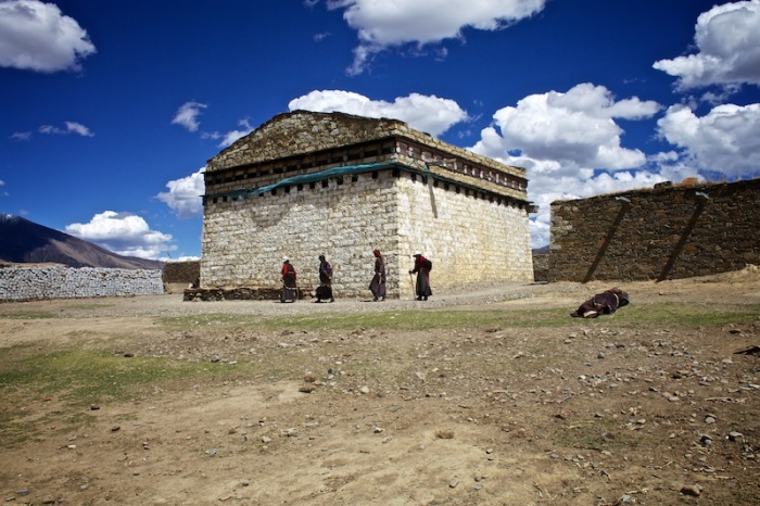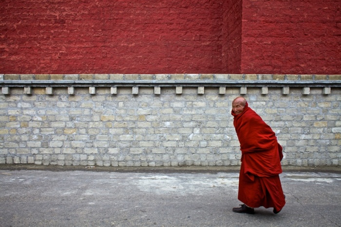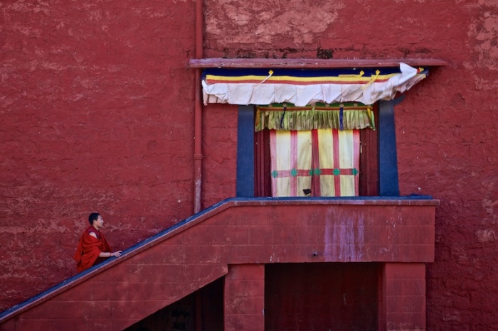 Монах направляется к черному входу храма с красочными стенами, основанного третьим Далай-ламой Сонамом Гьяцо в 1580 году, для проведения молитвы.