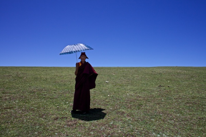 Этот регион славится чрезвычайно изменчивой погодой, поэтому монах предусмотрительно взял с собой зонт, чтобы укрыться от солнца и защититься от дождя.