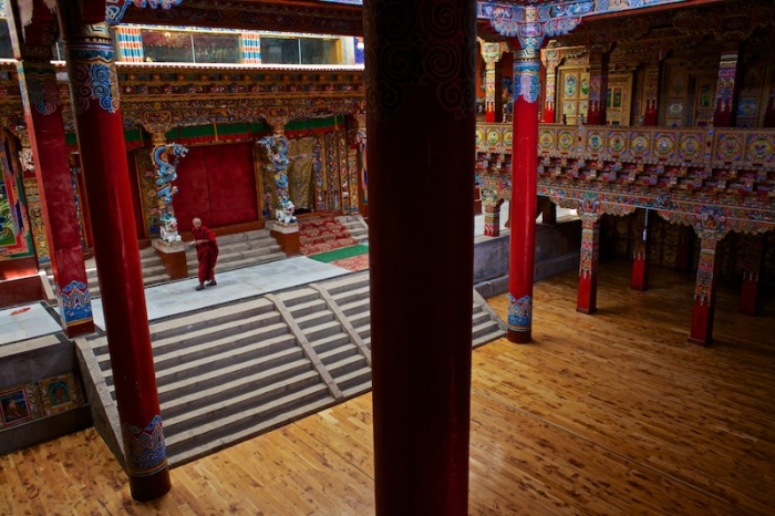 Монах в красочном расписном интерьере монастыря, что расположен небольшом городке Литанг на высоте 4014 метров над уровнем моря.