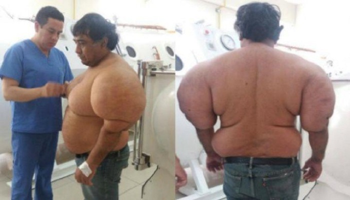 Необычная трансформация тела Алехандро произошла после одного из погружений за морепродуктами. Дайвер очень быстро поднялся с глубины 30 метров на поверхность, что повлекло за собой необратимые последствия в организме. Азот, содержащийся в крови в виде пузырьков, попал в мышечную ткань, отчего произошло ужасное распухание верхней части тела.