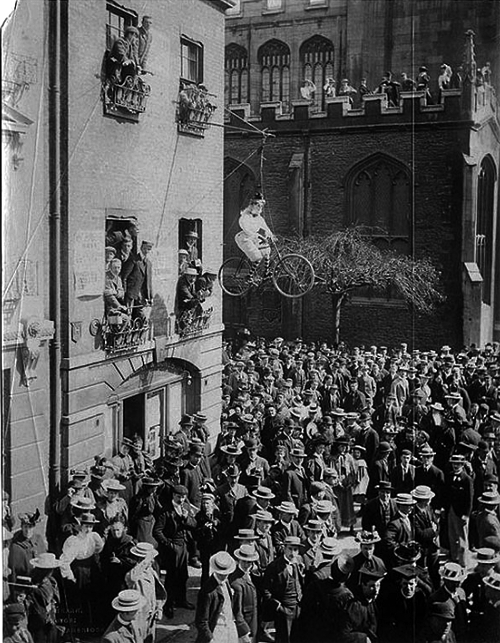 Студенты Кембриджа на митинге против приема в университет женщин. Чучело женщины на велосипеде – символ феминизма. Великобритания, 1897 год.