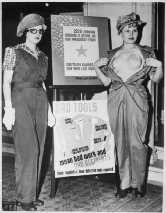 Представление защитной униформы для женщин, работающих на военных заводах. Девушка справа демонстрирует защитный бюстгальтер из пластика. США, 1943 год.