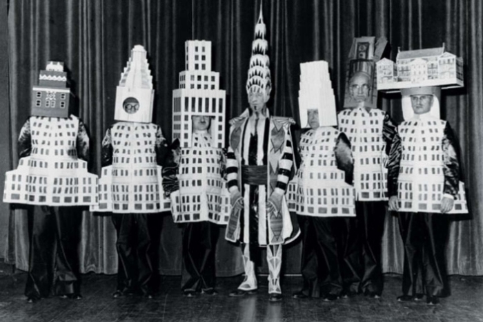 Больше двадцати архитекторов пришли на Нью-Йоркский Бал изящных искусств в 1931 году в костюмах зданий, которые они сами спроектировали. Слева направо: Стюарт Уокер в костюме Фуллеровского небоскреба, Леонард Шульце, одетый в отель «Уолдорф-Астория», Эли Жак Кан в образе небоскреба корпорации «Сквибб», Уильям ван Ален в костюме Крайслер-билдинг, Даниэль Уэйд в башне «Метрополитен-Лайф», Ральф Уокер в макете Уолл-стрит-билдинг и Джозеф Фридлэндер, наряженный в Нью-Йоркский городской музей.
