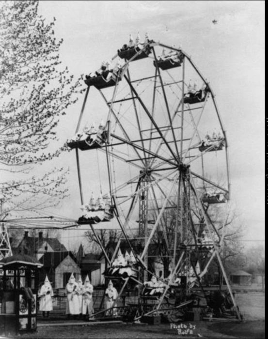 Члены организации Ку-Клукс-Клан катаются на колесе обозрения в 1925 году. Ку-клукс-клан - это ультраправая организация в США, отстаивавшая такие идеи, как превосходство белых или белый национализм. В середине XX века организация активно выступала также против коммунизма.