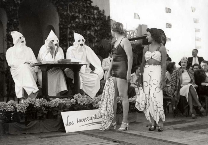 Две дамы в купальниках проходят мимо трёх представителей ультраправой организации ку-клукс-клан во Франции в 1937 году.