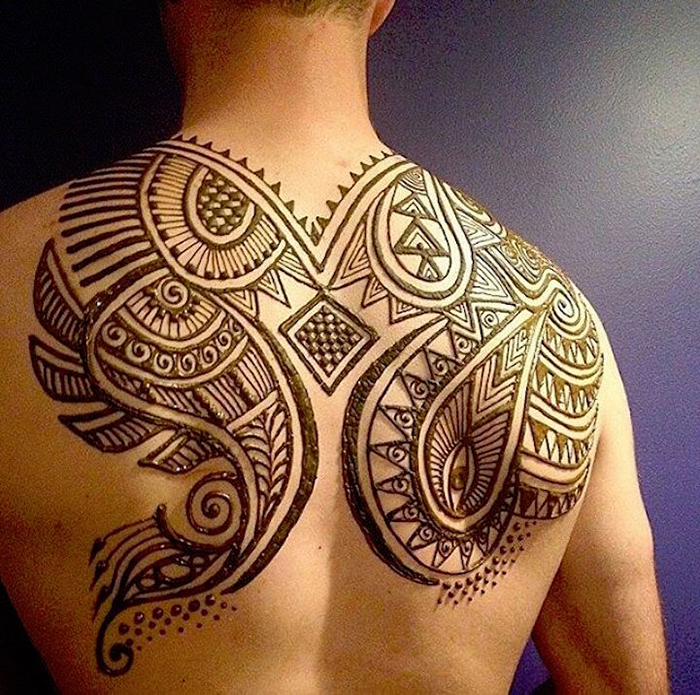 Девушки чаще всего отдают предпочтение росписи кистей рук или стоп, мужчины в этом вопросе более оригинальны – они смело экспериментируют с масштабными рисунками, нанесенными на грудь, спину, плечи, шею. Словом, простора больше и, соответственно, возможностей – тоже. Так у Сабрины рождаются прекрасные орнаменты.